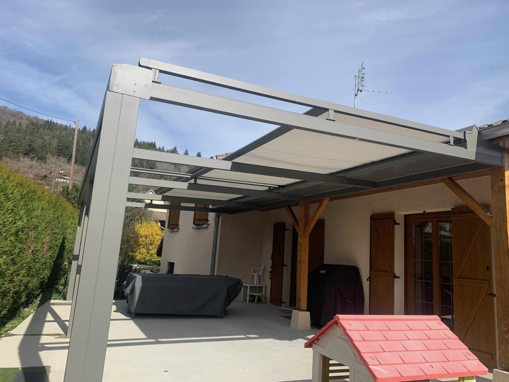 Pose d’une pergola 8000 x 4000 mm, stores de toiture motorisés et leds intégrées.